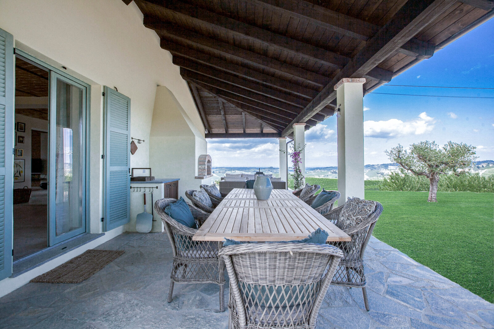 The home’s covered terrace was originally a large space added to the house and used as a garage, which is typical in Piedmont, where locals often use sheds, barns, and garages to store equipment for maintaining rural properties and surrounding land. During the renovation, the garage was transformed into a spacious, covered terrace, complete with lounge furniture and a pizza oven, offering a view of the idyllic vineyard.